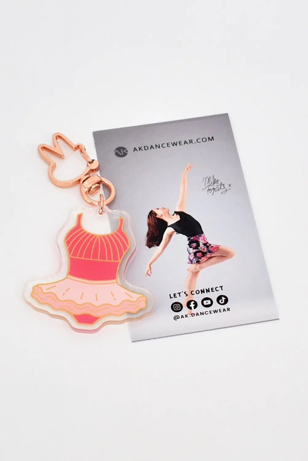 Double-sided acrylic keepsake “tutu-year” keychain. Rendering of AURORA leotards in Blush and Lilac from Core Collection. Complete with a cute, charming bunny-shaped rose gold metal swivel clasp hardware.