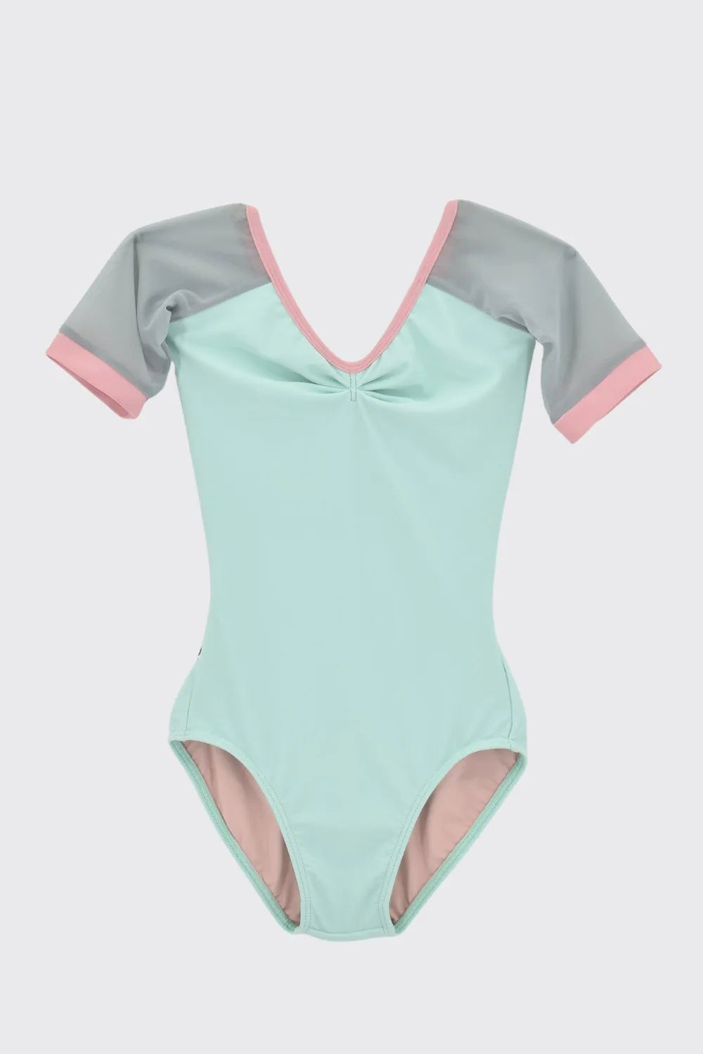 Tailored for dancers who appreciate both style and ease, this leotard effortlessly blends beauty and functionality. In a captivating fusion of serene green hues inspired by the tranquility of sage, the CHLOE in Sage Leotard captivates with its enchanting color scheme. The premium mesh detailing, known for its luxurious feel, adds a touch of opulence to every movement. Delicate rose pink accents on the trim and elegant pinch front detailing on the bodice accentuate your feminine allure with grace.