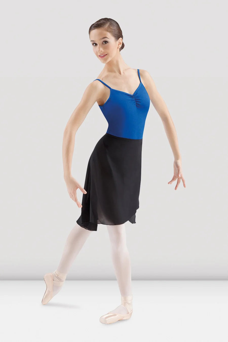 A classical style Georgette skirt which falls softly to the knee, crosses over at the front of the body and ties neatly at the back. This skirt is a beautiful length for teachers to wear to class, as well as students studying variations that require a longer length skirt for movement. Available in basic black, you can pair it with a black leotard or a different color for a contrasting look.