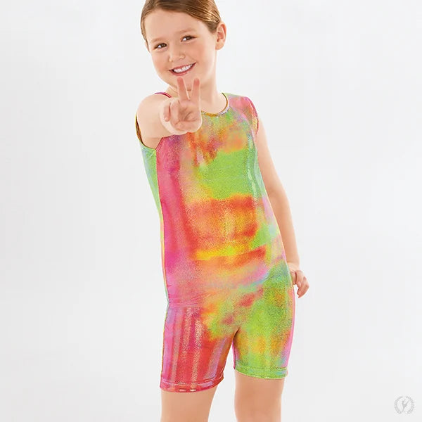 Nylon/Spandex tank biketard with a high scoop neck and moderate scoop back design. Sky blends blue, turquoise, pink and purple with a full metallic foil creating an iridescent sheen. Citrus blends pink, orange and yellow with a full metallic foil creating an iridescent sheen.