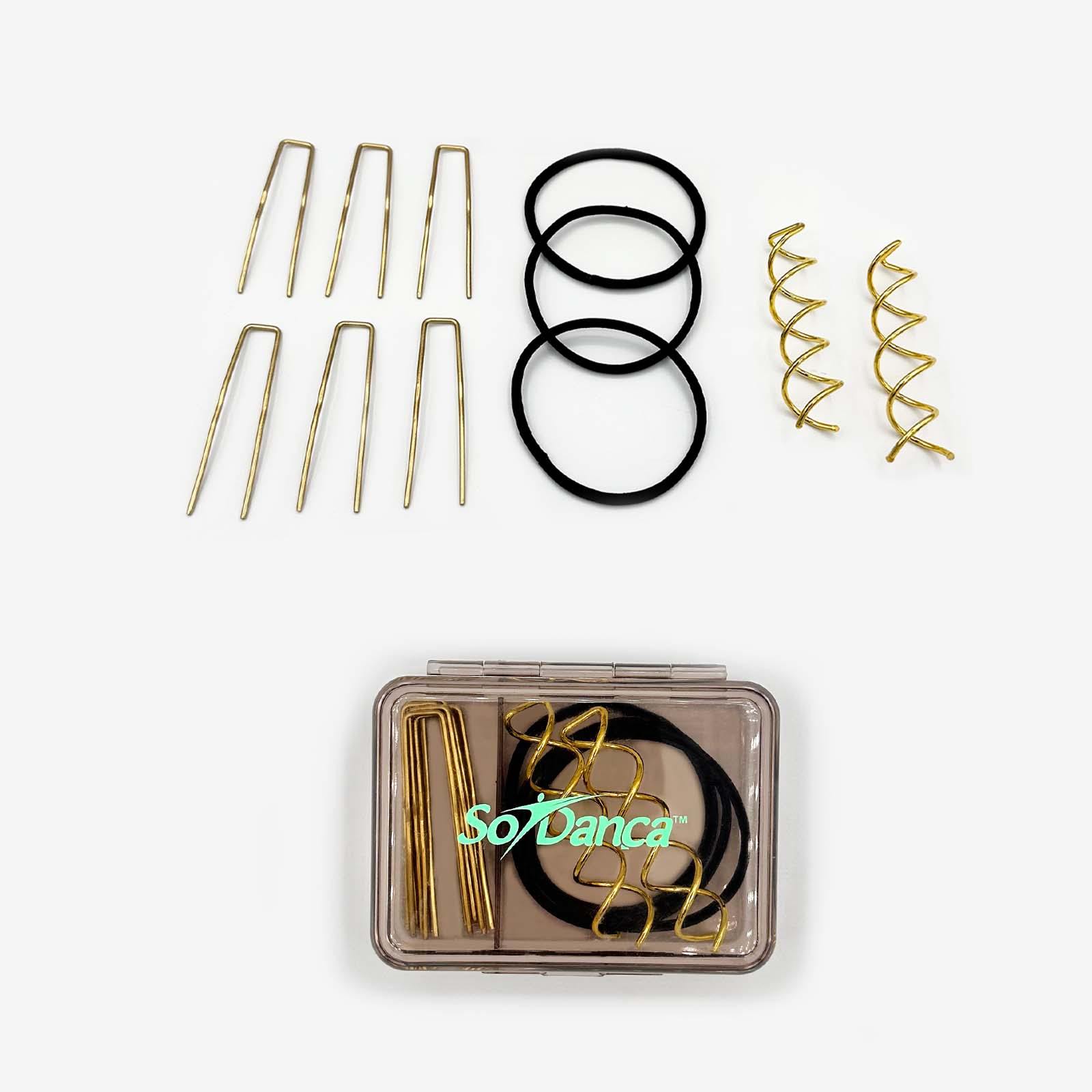 3 ouch-less hair ties, 2 spiral hair pins, 6 large sprung bun pins. 3.5"" x 3"" x 2"" case.