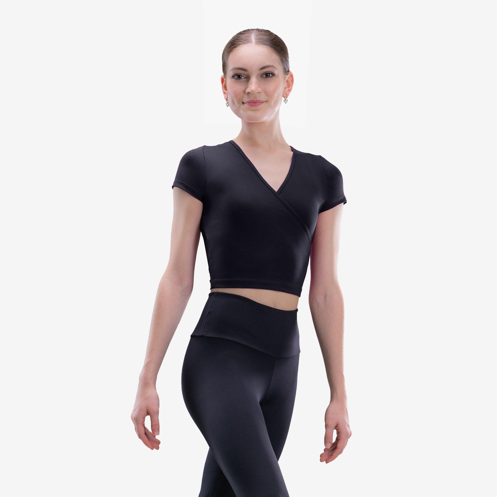 Adult mock wrap top with short sleeves.