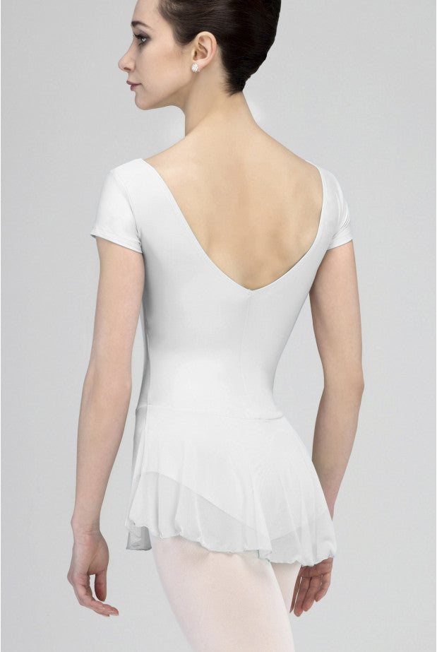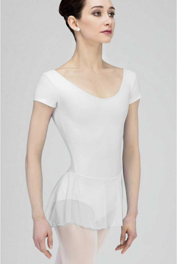 Short sleeve microfiber basic dress, featuring a modest, high back-cut and an attached four-way stretch tulle skirt.