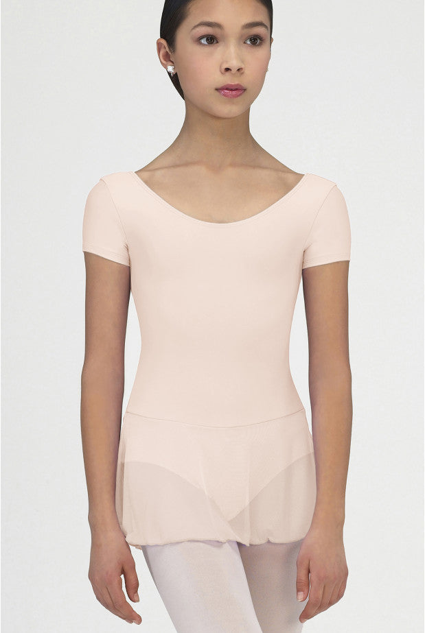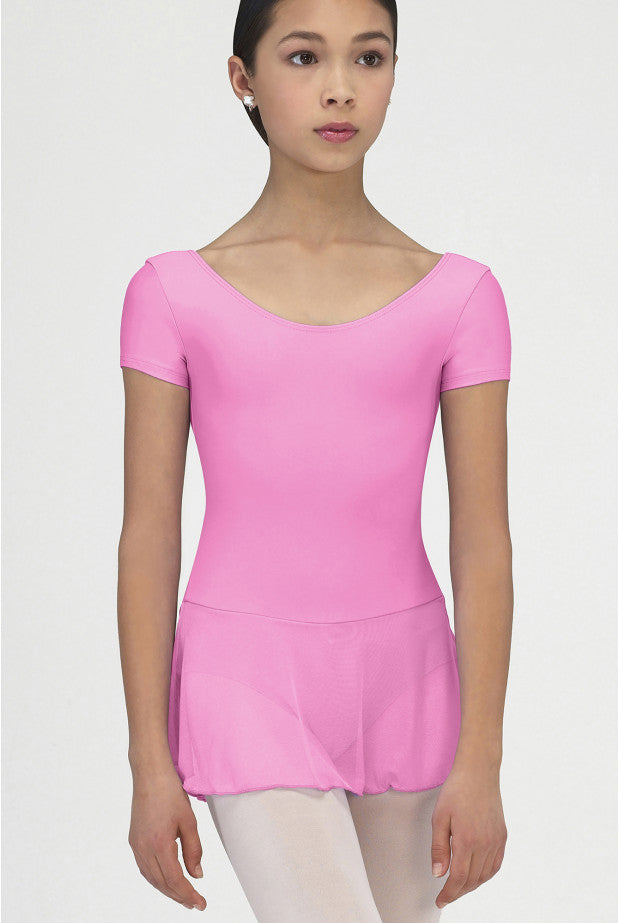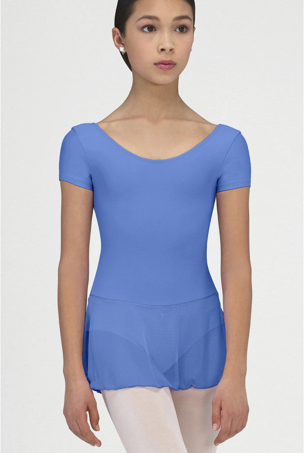 Short sleeve microfiber basic dress, featuring a modest, high back-cut and an attached four-way stretch tulle skirt.