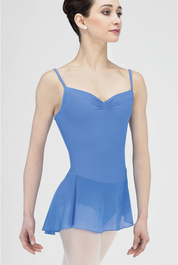 Microfiber basic, simple and elegant camisole dress, with a mid-back profile, front pinch, and attached four-way stretch tulle skirt.