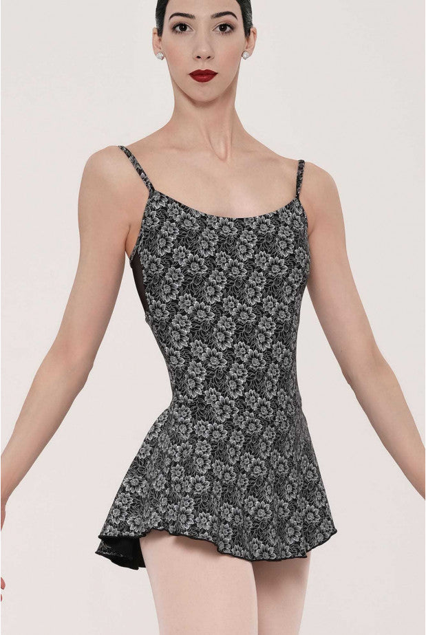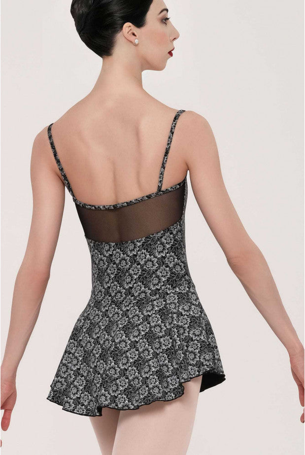 The transparent stretch tulle panel along the backline and the camisole straps lend the style even more elegance. The Camelia skirted leotard will be a hit in your dance class and its floral pattern will remind you of a lush garden of anemones.