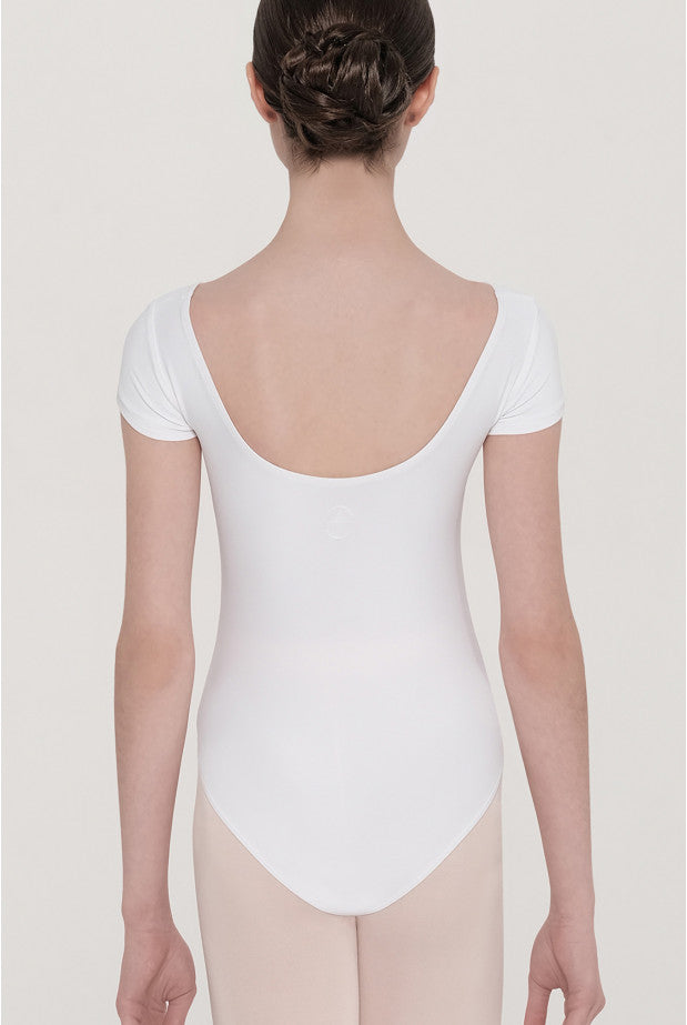 Classic short sleeve microfiber leotard with a gathered scoop neckline and scoop back.