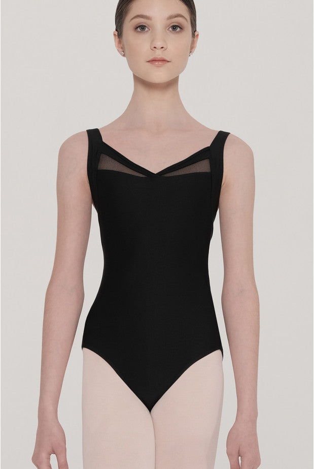 Microfiber leotard with a camisole cut detailed with sheer stretch tulle, revealing skin on the upper neckline and middle back through a small triangle cutout. Deep open back.