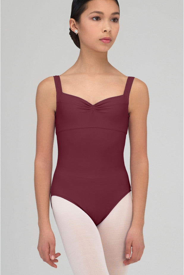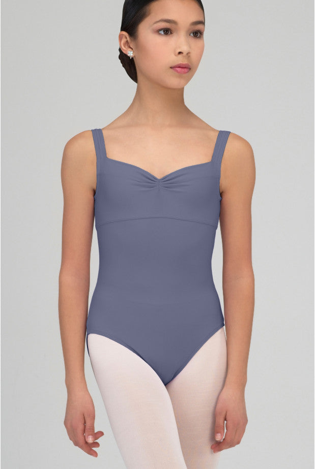 Elegant pinch front tank leotard with underbust detail made with soft microfiber.