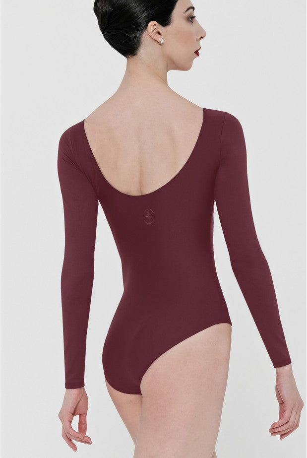 Classic long sleeve leotard in microfiber with a gathered scoop neckline and scoop back.